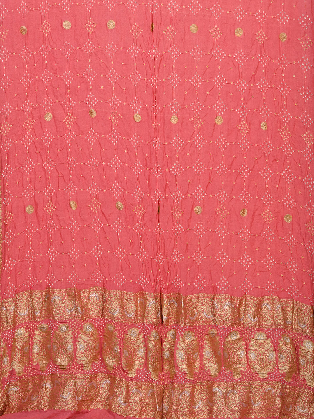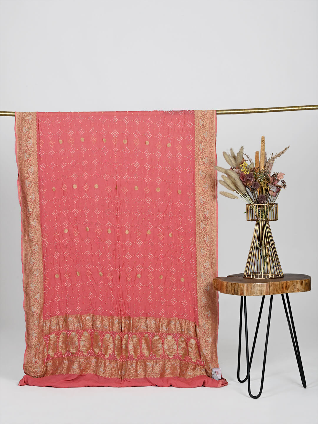 - This handwoven Banarasi saree is decorated with intricate Bandhej design. A Complete classic heirloom in kutchi bandhani technique with zari butas.