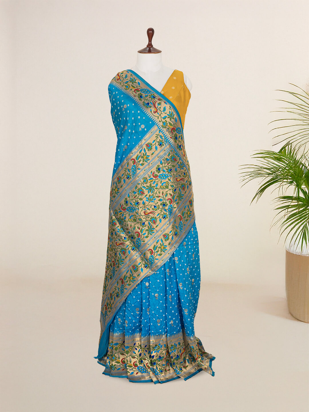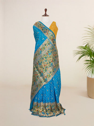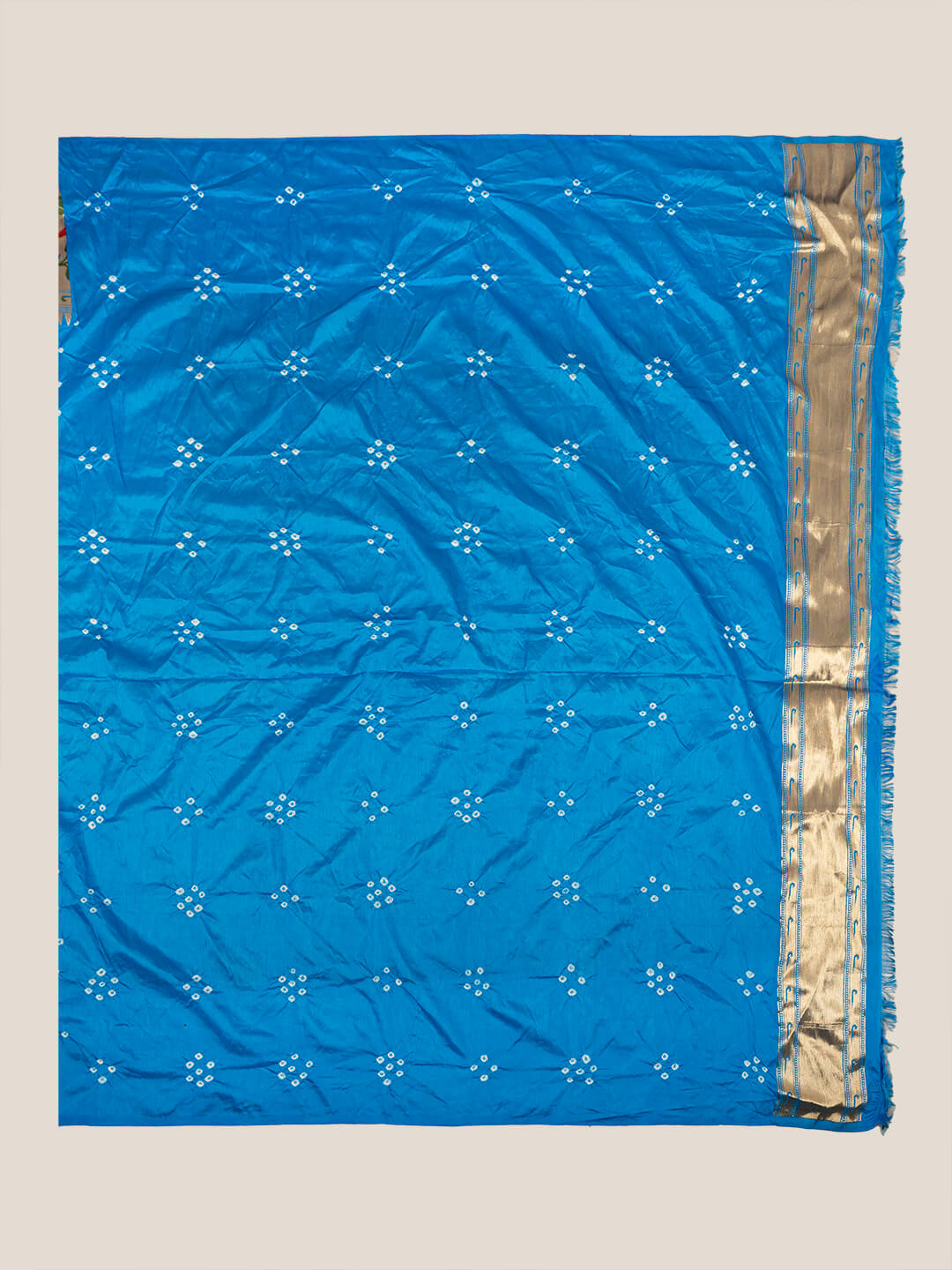 - This exquisite handwoven Bandhani saree is a fusion of Gujarati Patola and Banarasi Weaving Technique. The weaves of the saree is inspired by traditional Patola design woven in Tilfi Banarasi technique using 3 colours of Meena. This masterpiece will set you apart from the crowd.