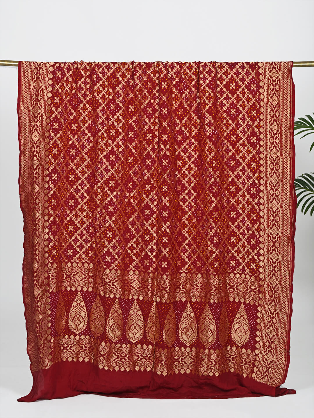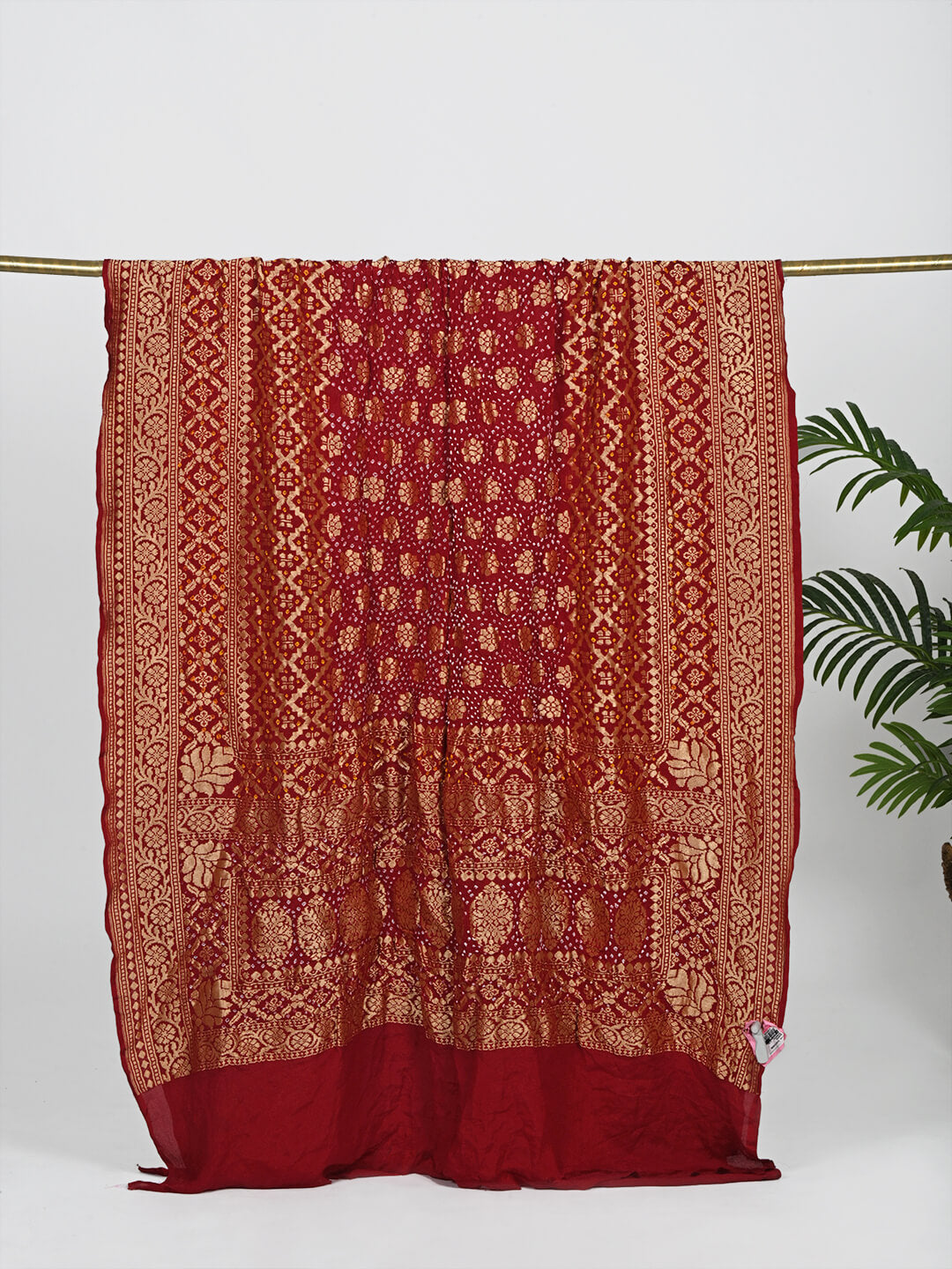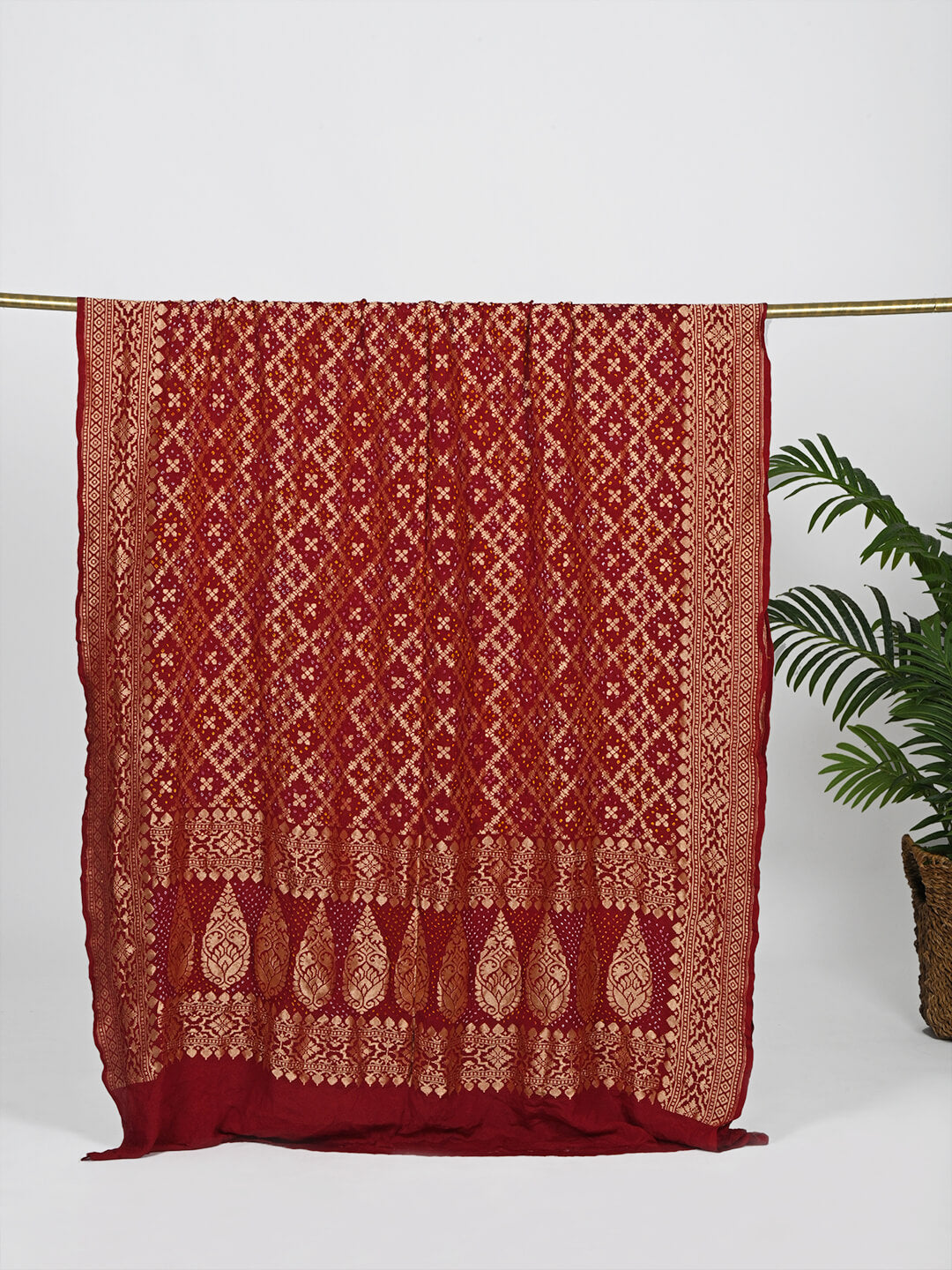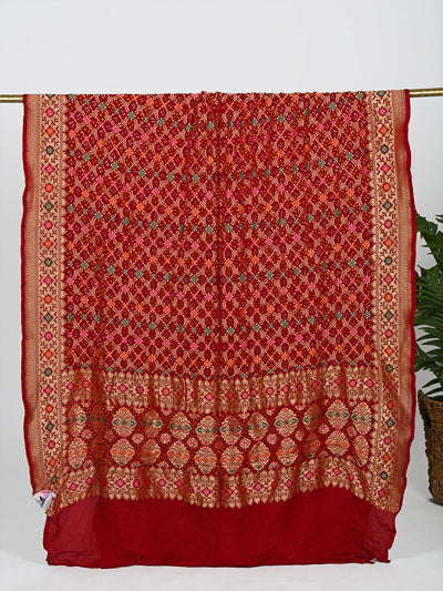- All over zari floral work covers the body of this Dupatta, to create a rich and dense design with intricate Bandhej inside. This Dupatta is popularly known amongst our customers as "Barfi"