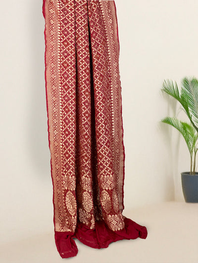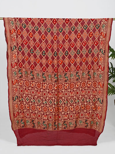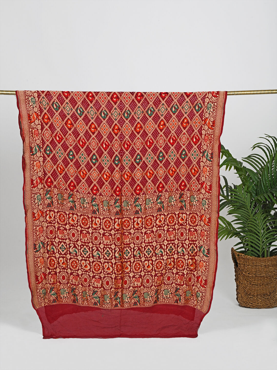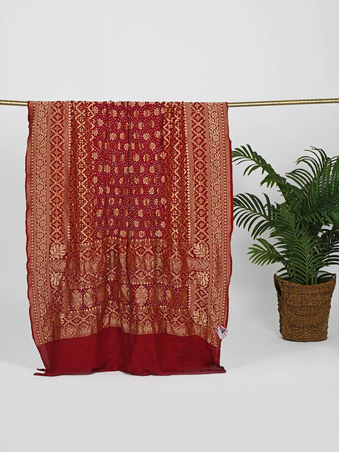 - All over zari floral work covers the body of this Dupatta, to create a rich and dense design with intricate Bandhej inside. This Dupatta is popularly known amongst our customers as "Barfi"