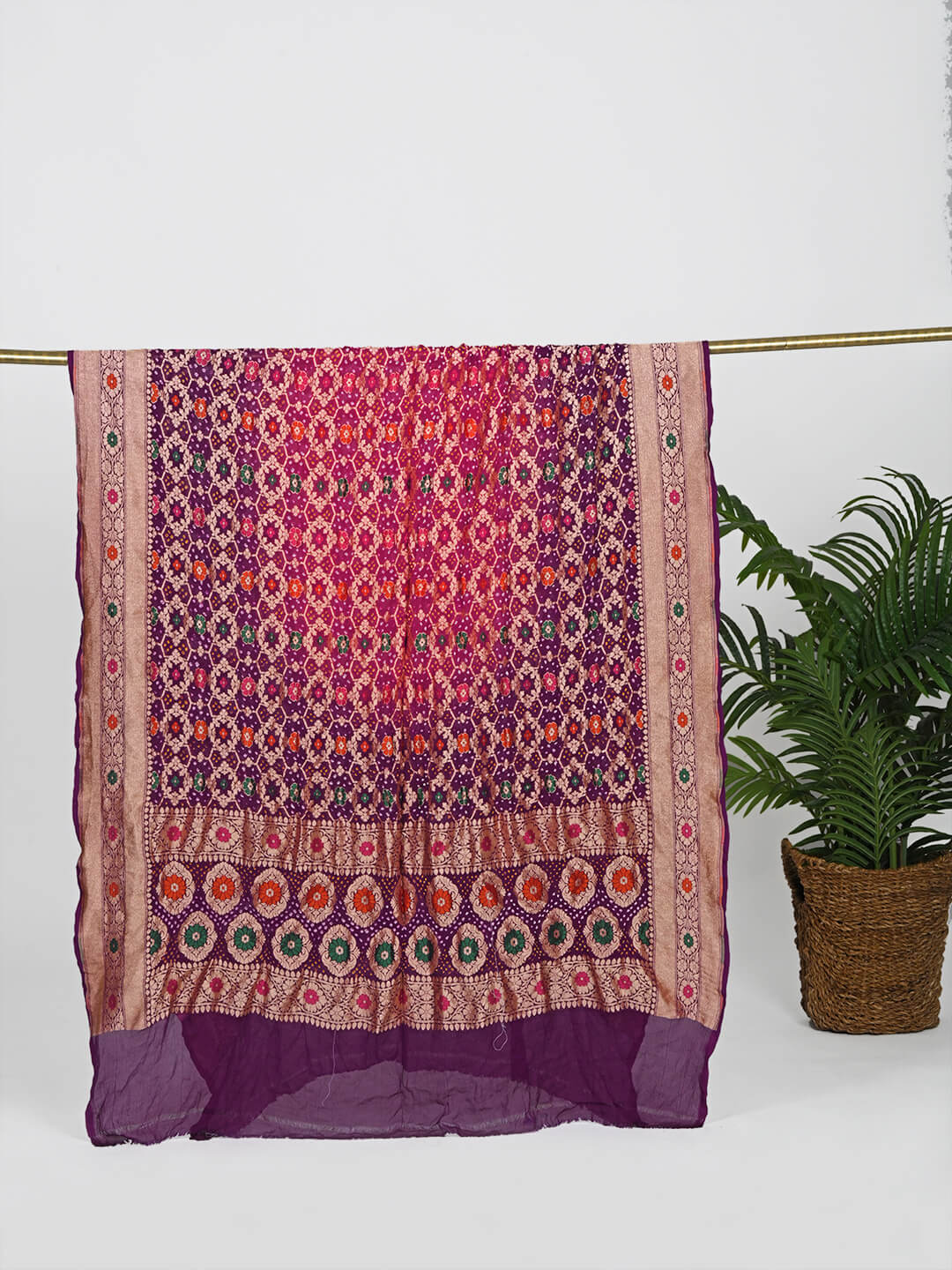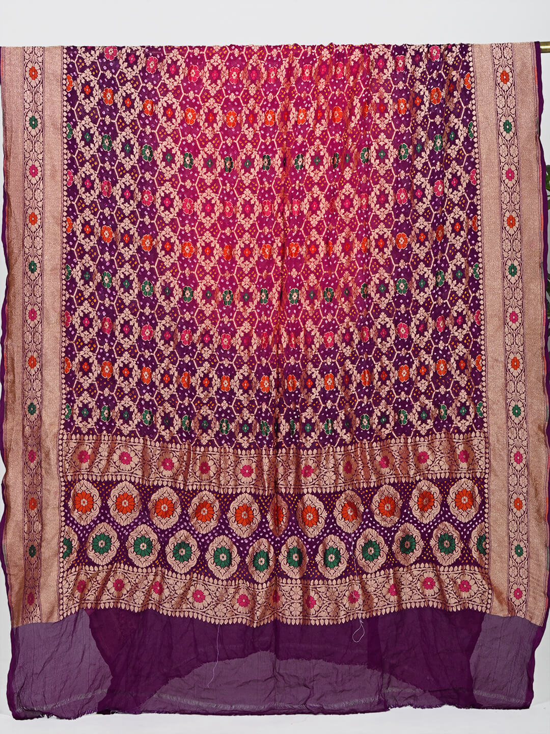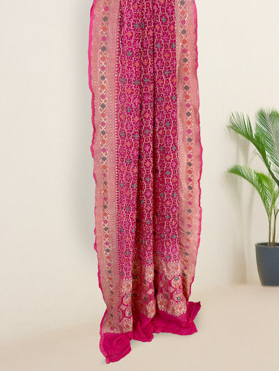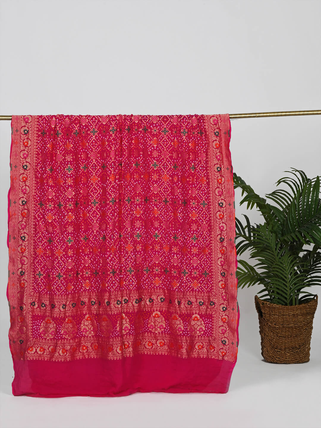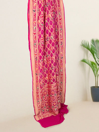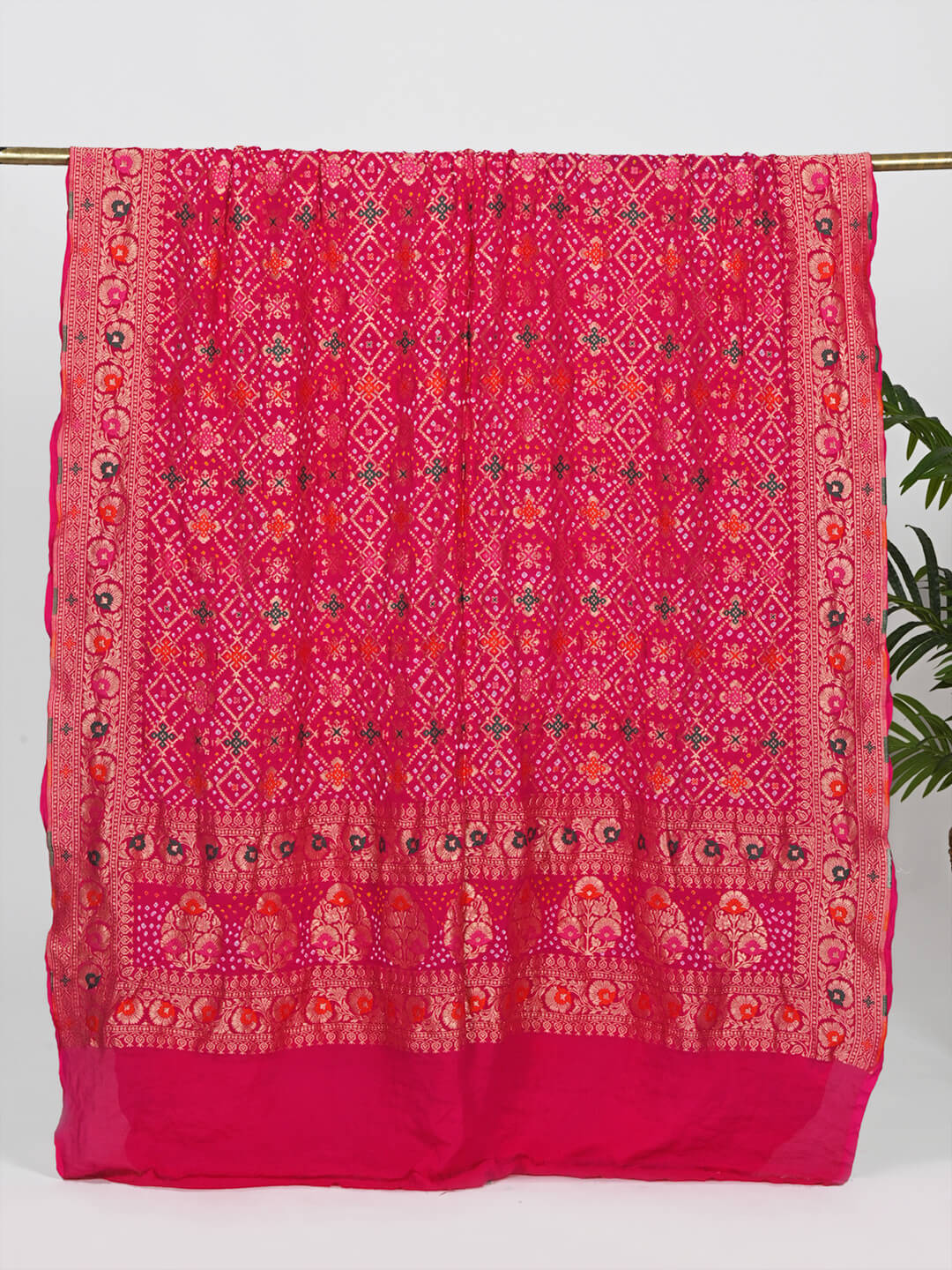 - This Minakari Bandhani Dupatta has been made with the pain staking addition of the supplementary coloured resham threads during the hand-weaving process. This adds different colours to the pattern complimenting the zari with intricate bandhani.