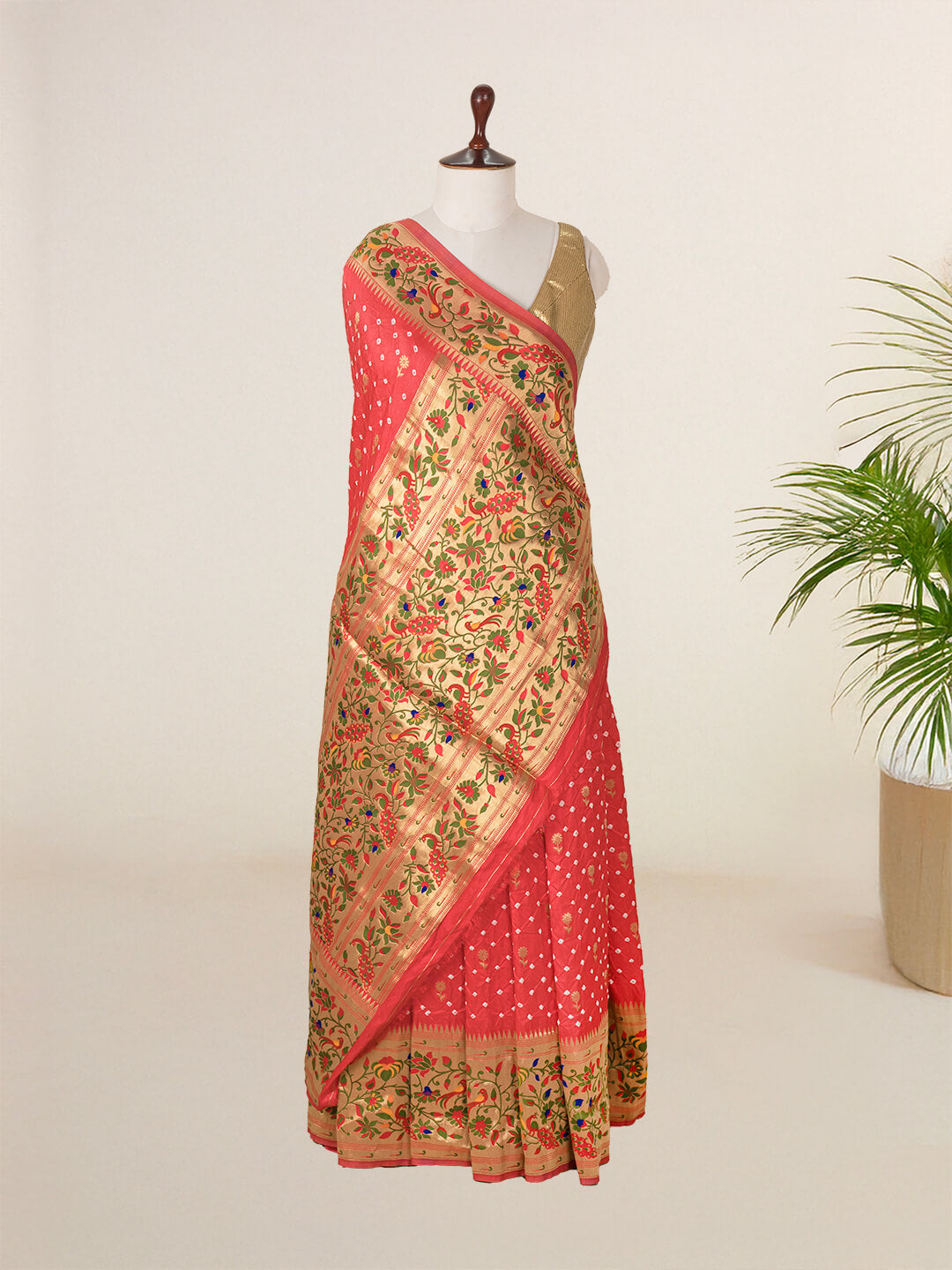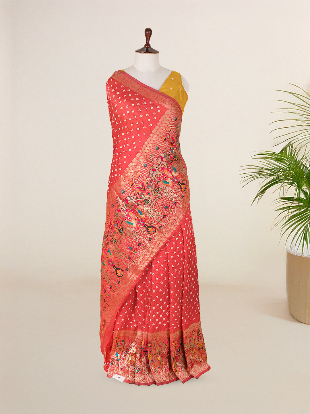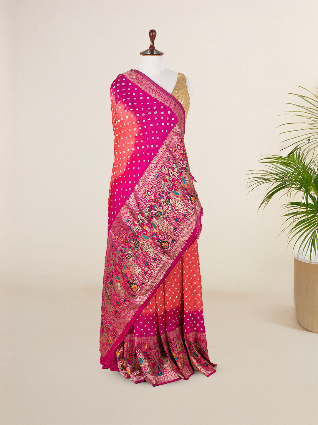 - This Saree is a fusion of Paithani and bandhani.The Pallu and Border of the Saree is Inspired by our Favouite Paithani weave with all traditional motives. This Saree has been tied-dyed in the Classic Kutchi Bandhani technique.
