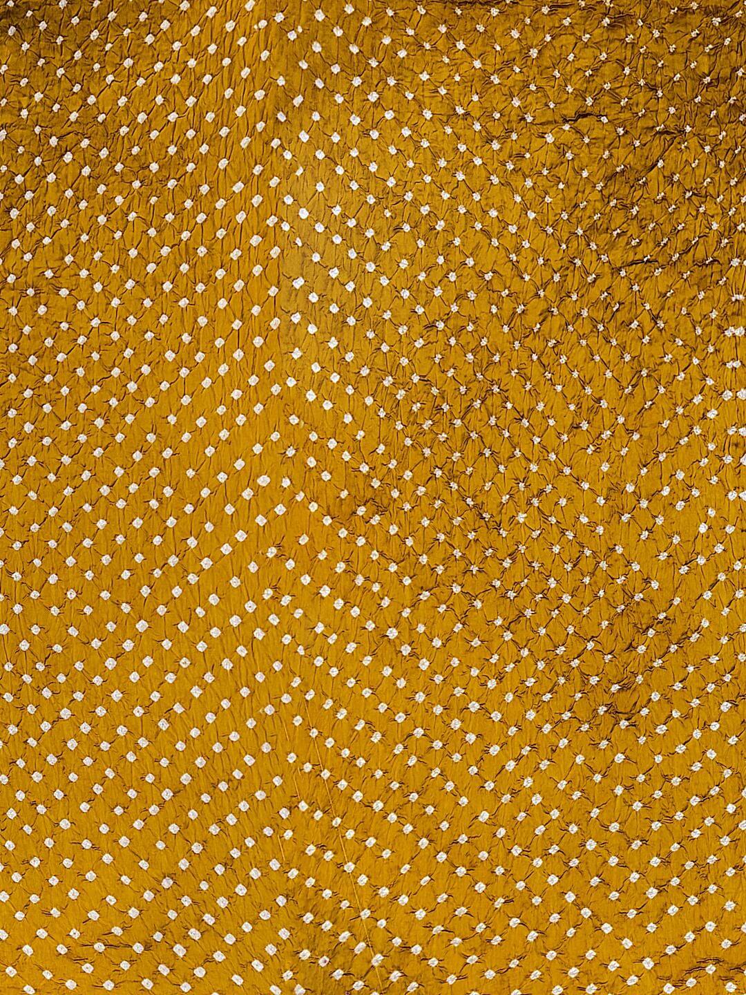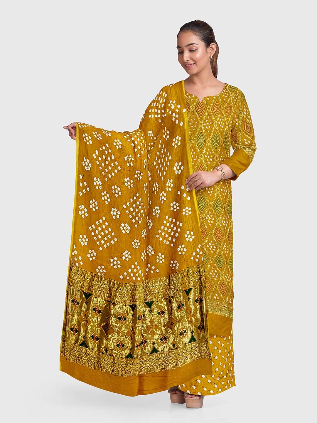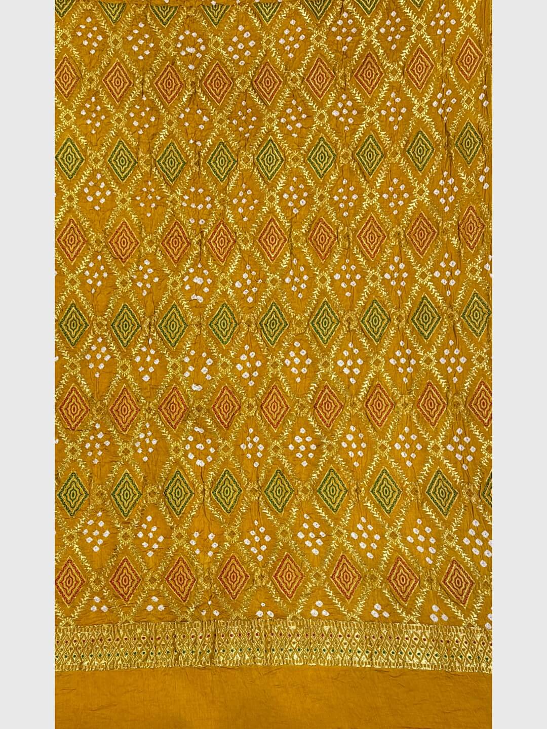- This Banarasi lehenga has been hand tied-dyed in the classic Kutchi Bandhani technique. It has rich floral kallis. It is accompanied with an unstitched blouse and a heavy jaal Bandhani Dupatta.