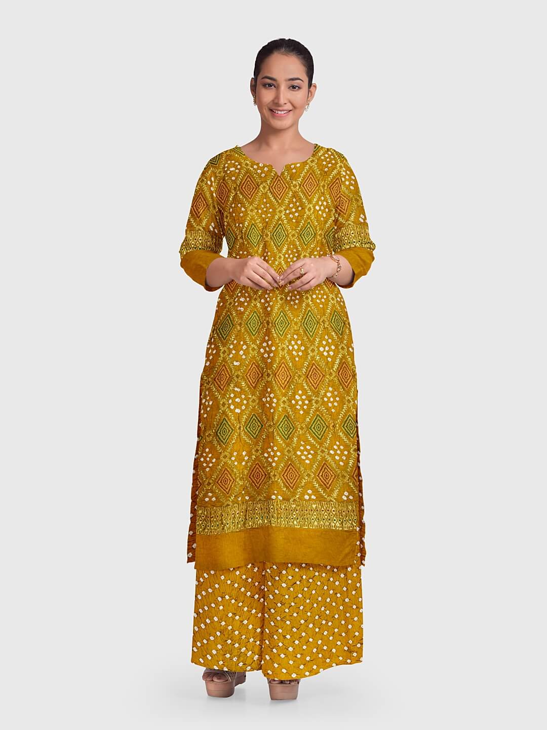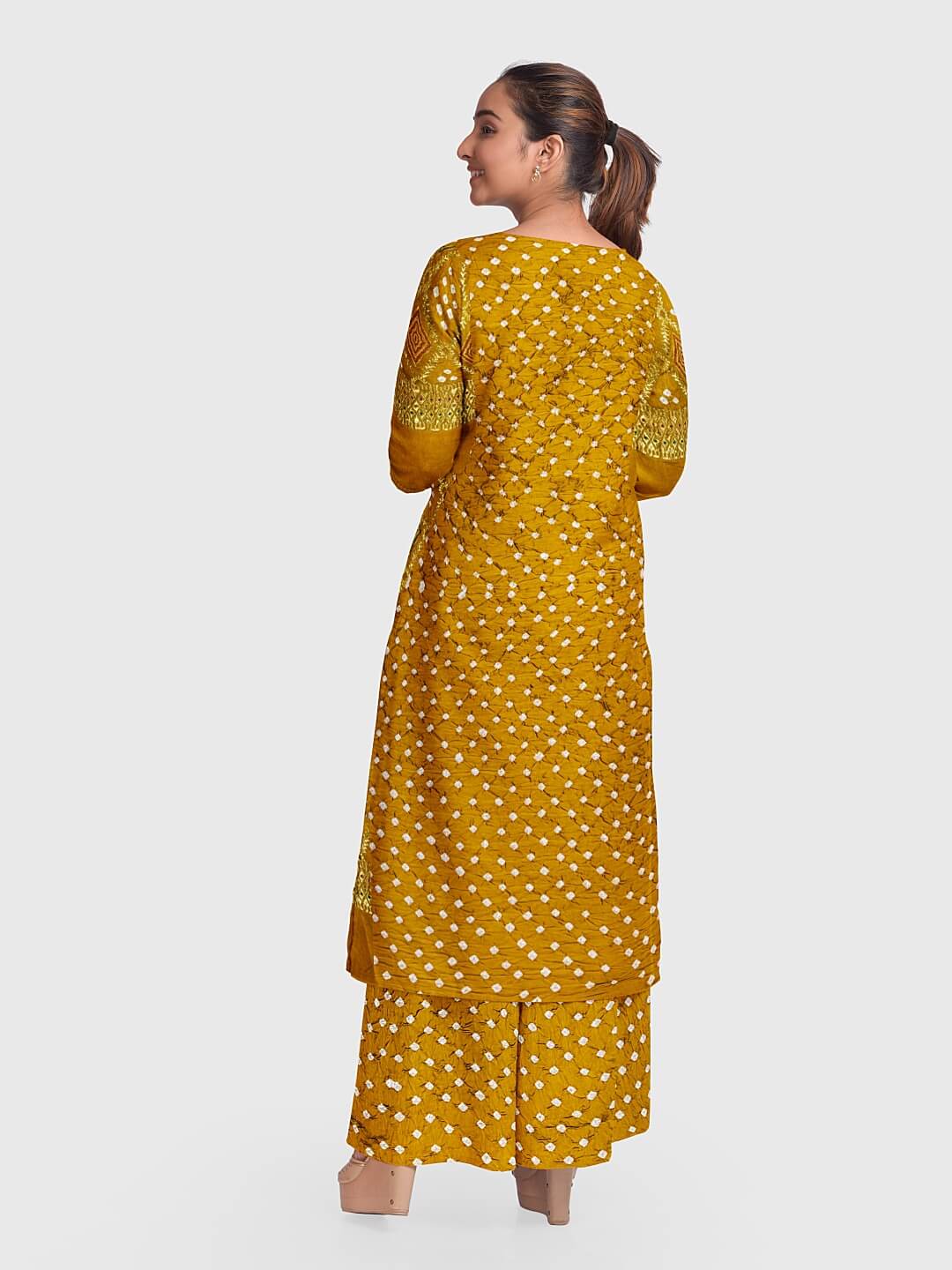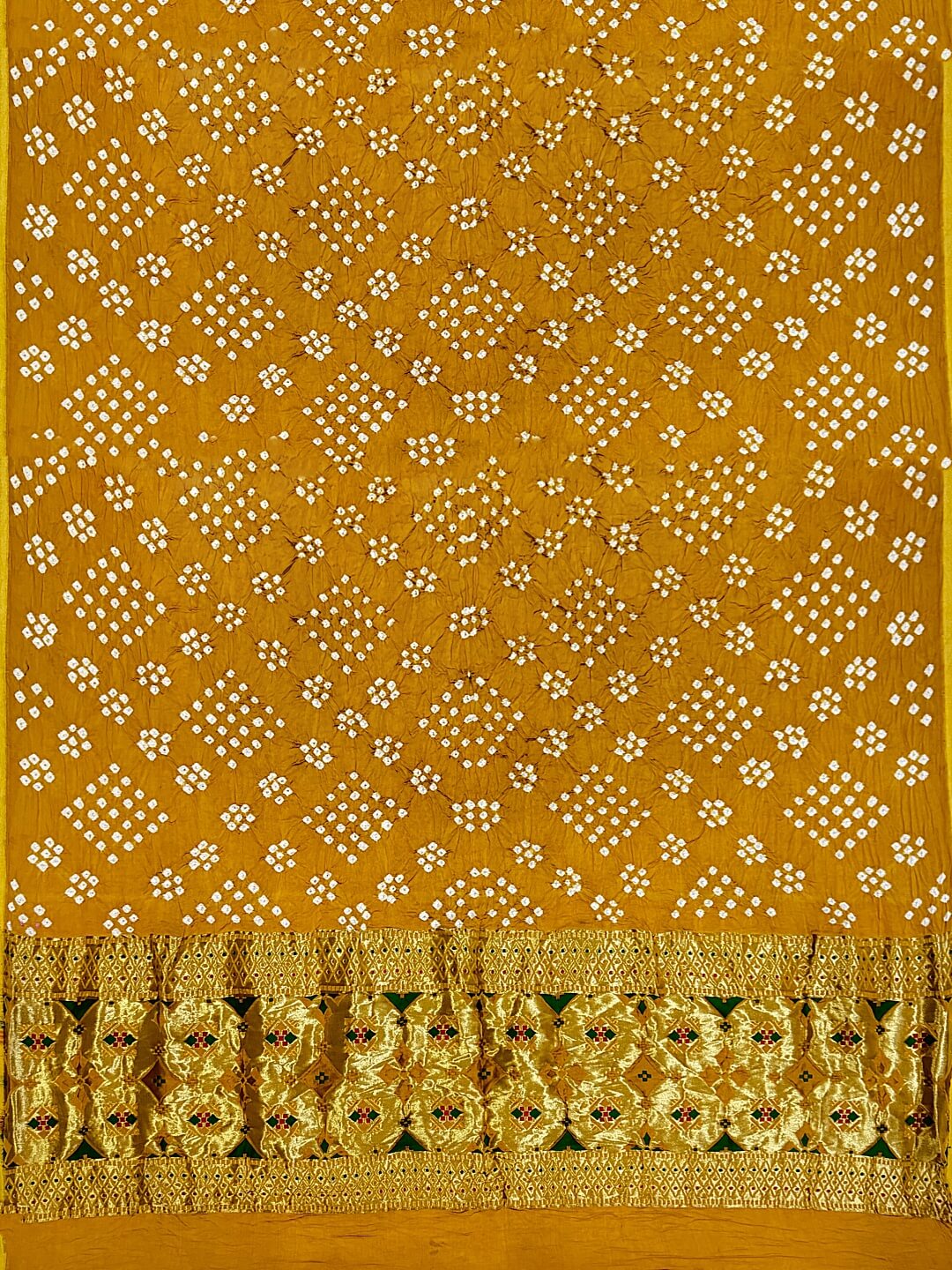 - This Banarasi lehenga has been hand tied-dyed in the classic Kutchi Bandhani technique. It has rich floral kallis. It is accompanied with an unstitched blouse and a heavy jaal Bandhani Dupatta.
