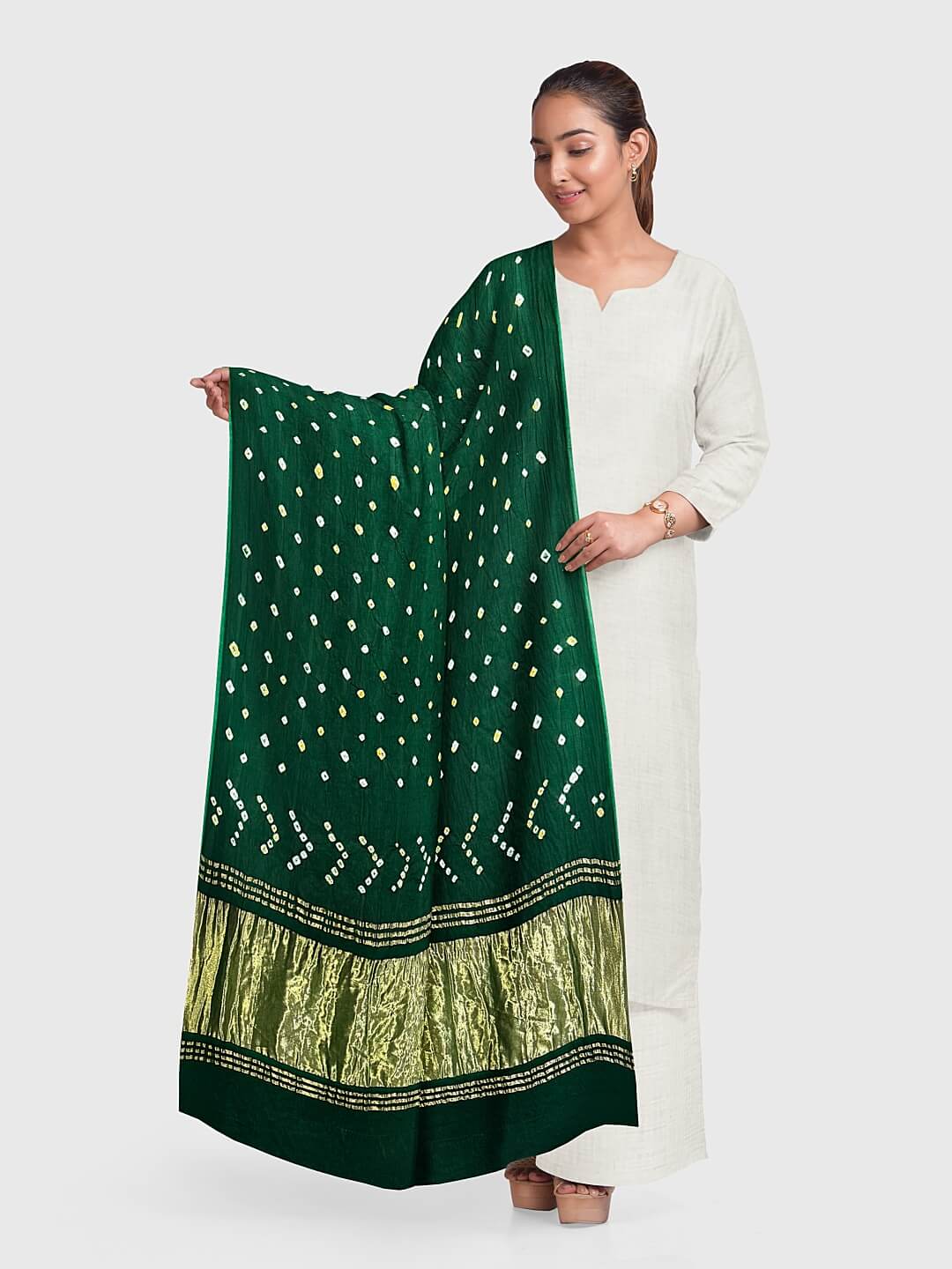 Bandhani textile art is a gift of tradition from ancestral artisans in the Indian subcontinent. This art form has its pride, culture, and heritage with years of history. Used variedly on cotton or luxurious Gaji Silk, the striking bandhani patterns are emblematic of excellent craftsmanship. The Gaji Silk bandhani dupattas are a trending pick for dressing up at any Indian wedding or event. Also known as Bandhej art, these exuberant dot prints celebrate the folk flair of artisans making their waves from local markets to the ramps of fashion weeks. It is evident from current fashion trends that bandhej dupattas are a versatile element in every wardrobe.