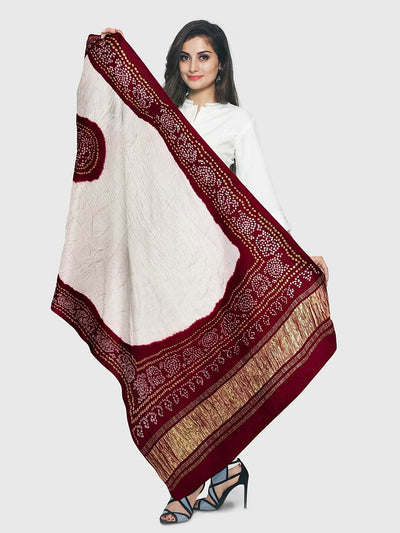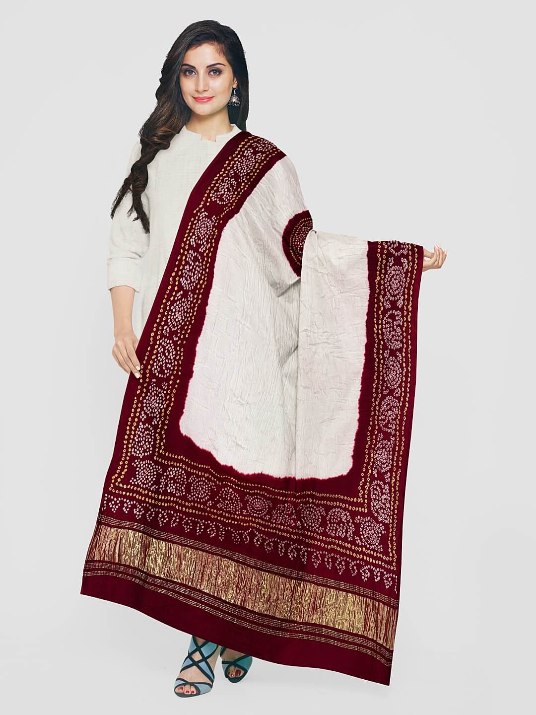 - This Minakari Bandhani Dupatta has been made with the pain staking addition of the supplementary coloured resham threads during the hand-weaving process. This adds different colours to the pattern complimenting the zari with intricate bandhani.