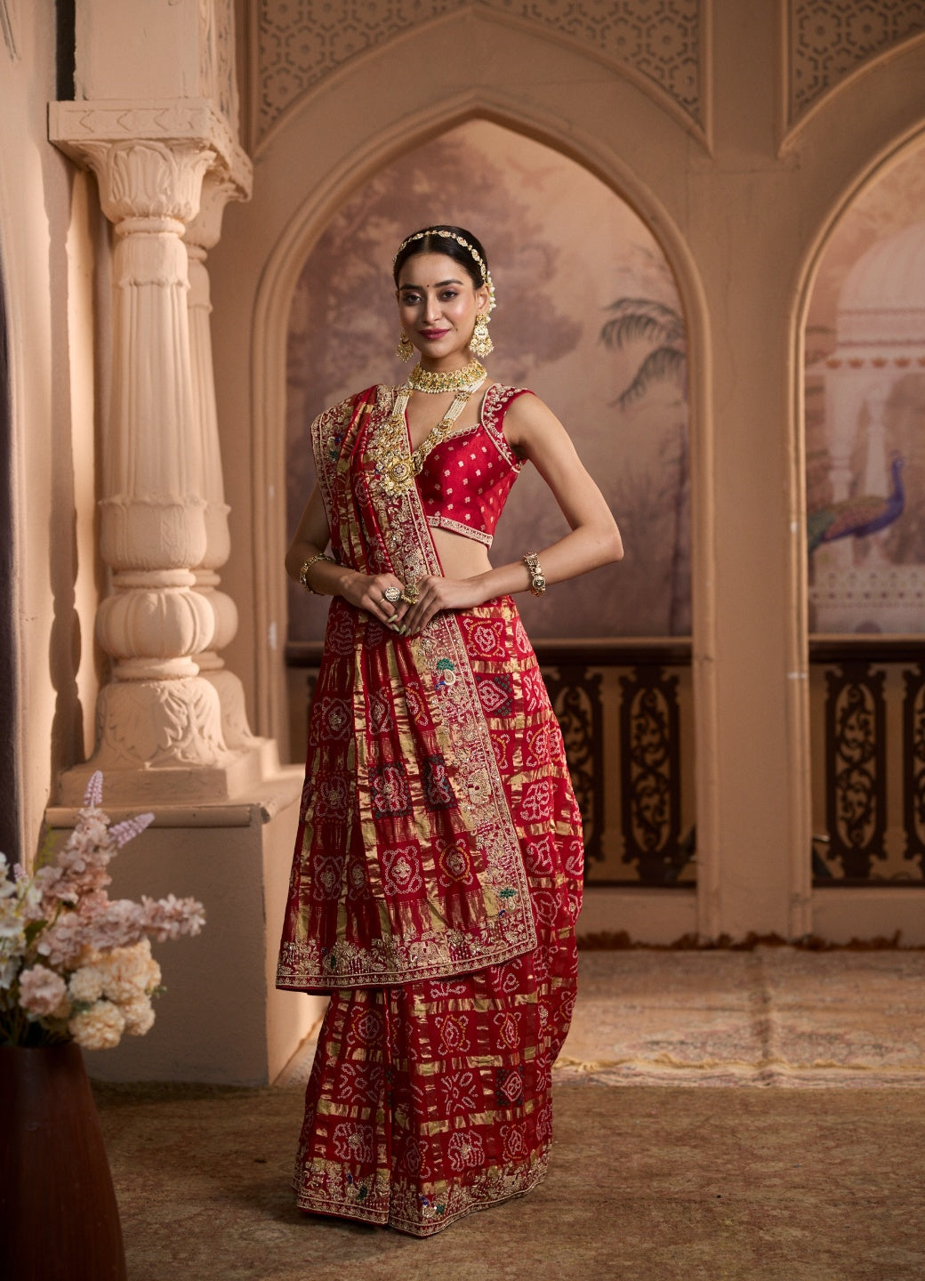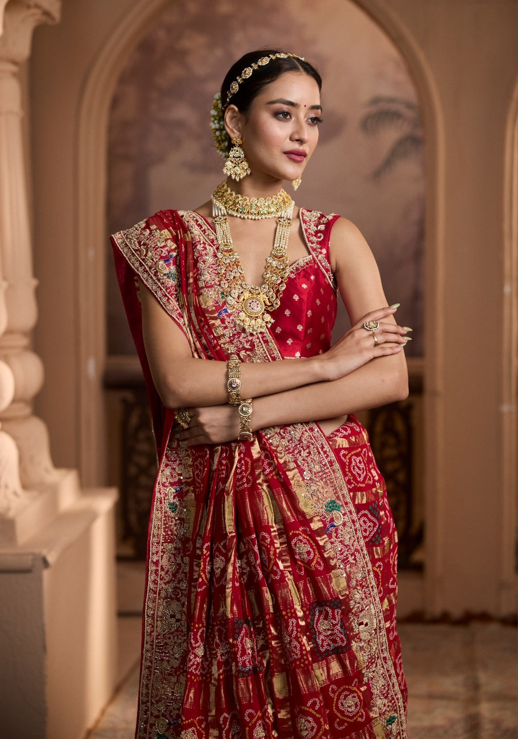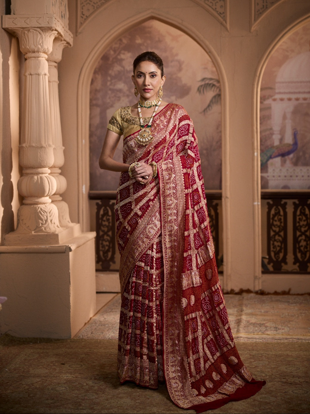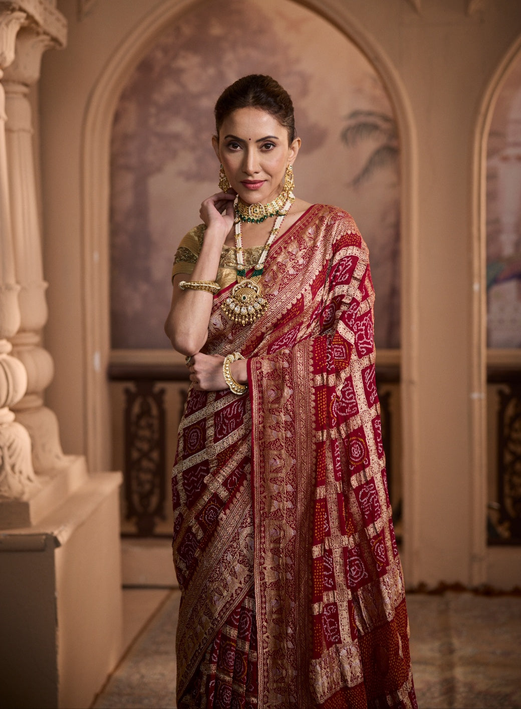 An integral part of Gujarat weddings, a Gharchola saree is an encapsulation of excellence made by Rajasthani and Gujarati weavers. It is a drape having striking tones of golden and red, grid pattern design, and bandhani impact look sublime.