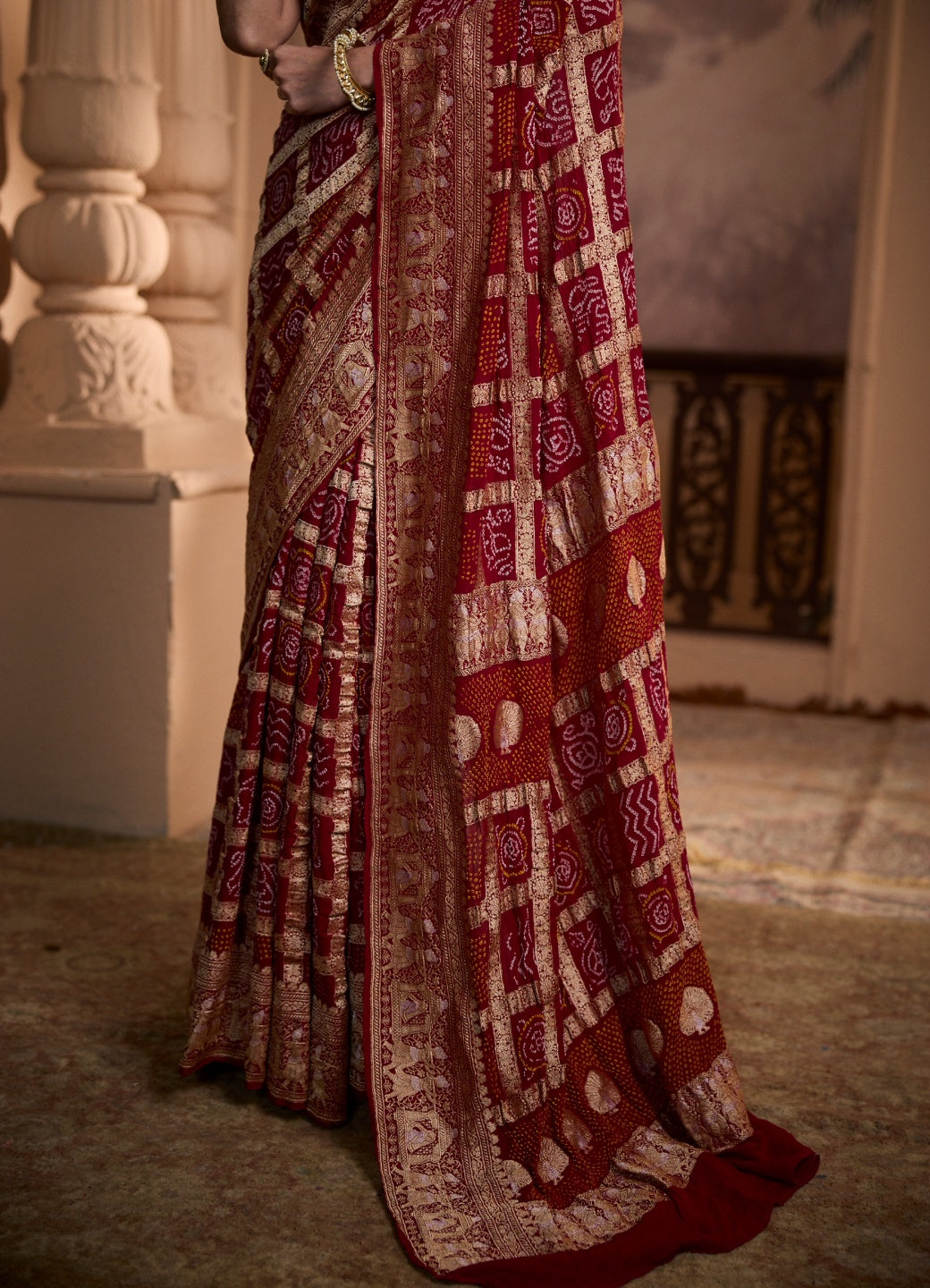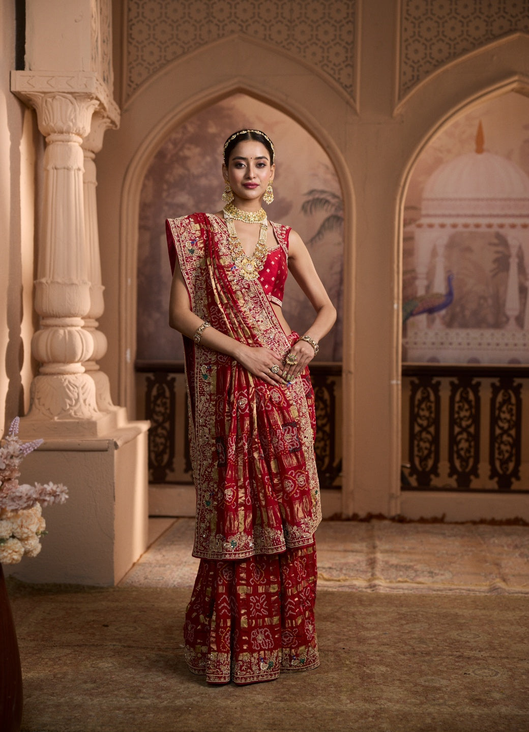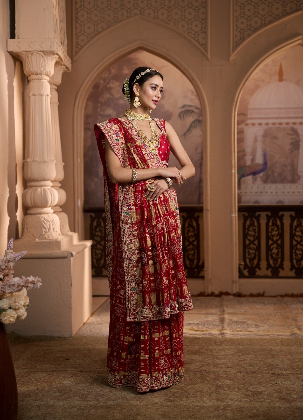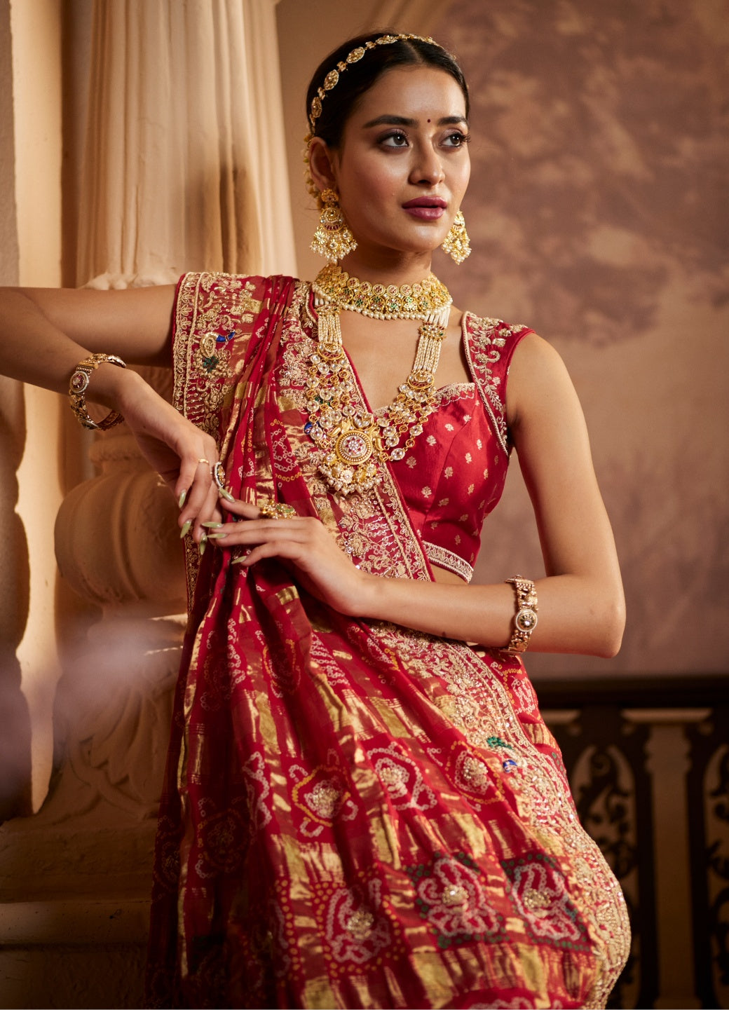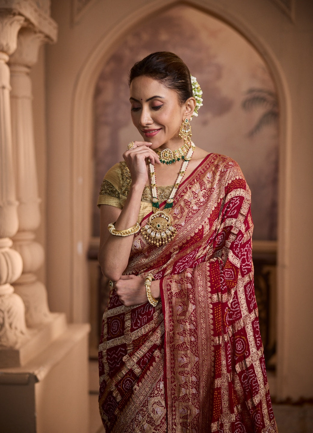 An integral part of Gujarat weddings, a Gharchola saree is an encapsulation of excellence made by Rajasthani and Gujarati weavers. It is a drape having striking tones of golden and red, grid pattern design, and bandhani impact look sublime.