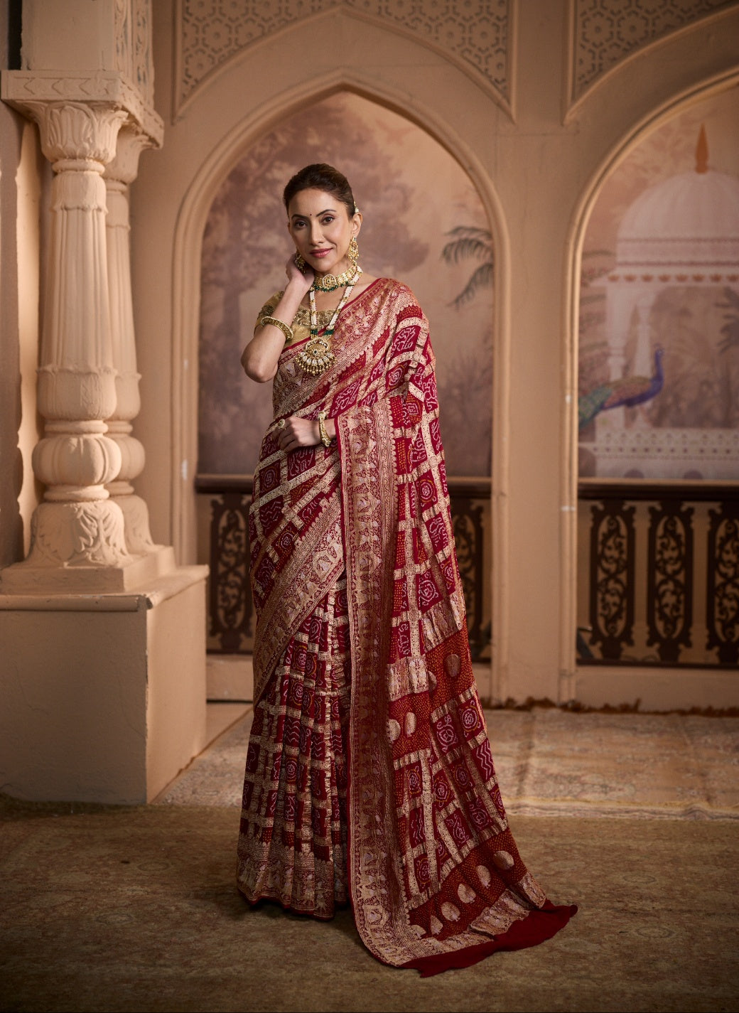 Khatri Jamnadas Bechardas brings you today their exclusive collection of gharchola sarees in Real zari cotton , Pure gaji Silk , Tested zari cotton, Banarasi style and embroidered in maroon and red colour.