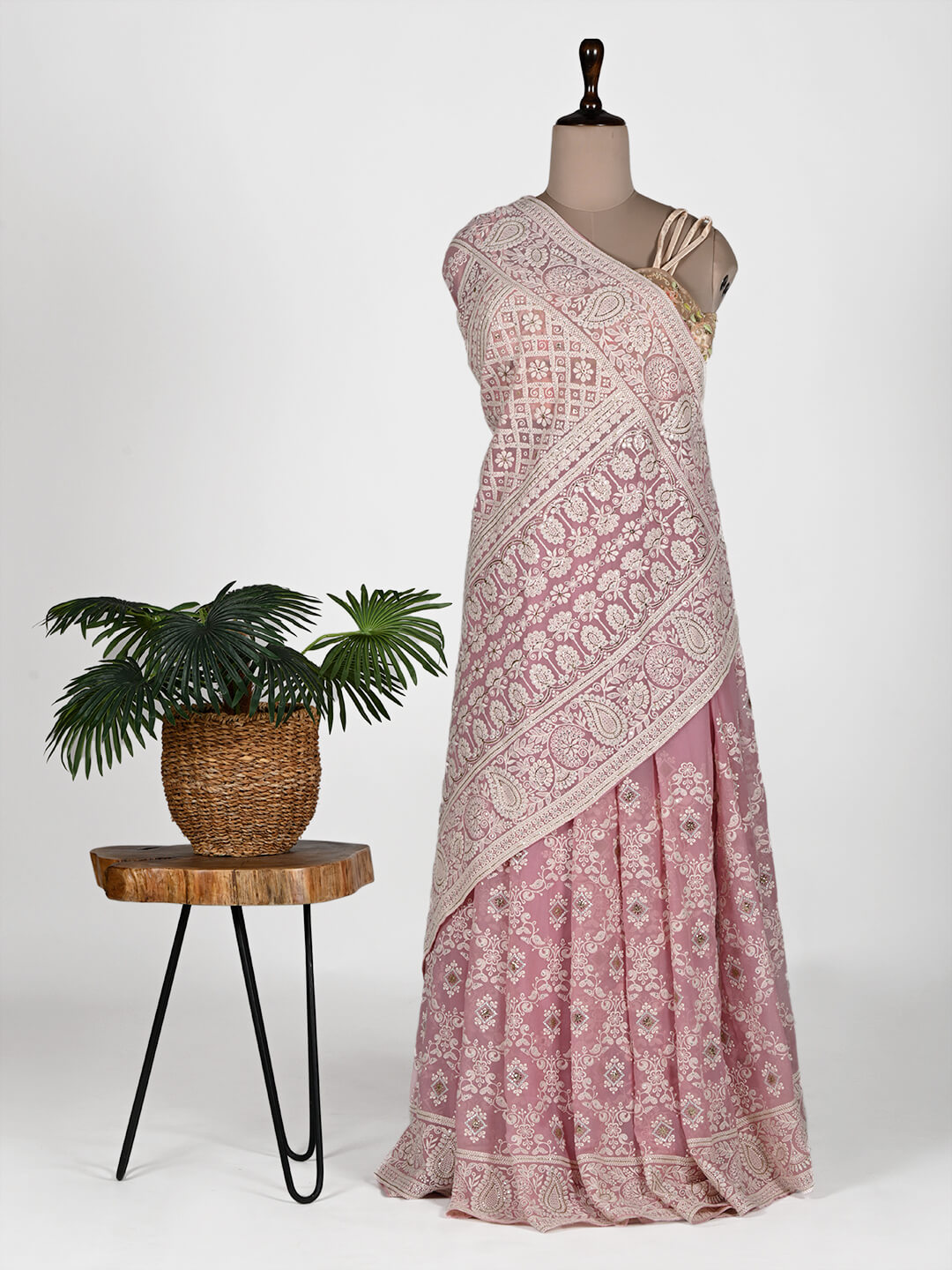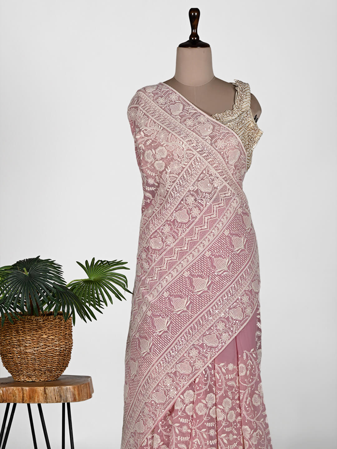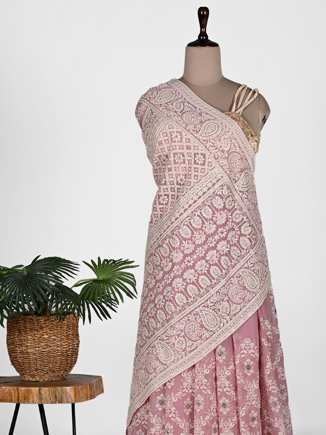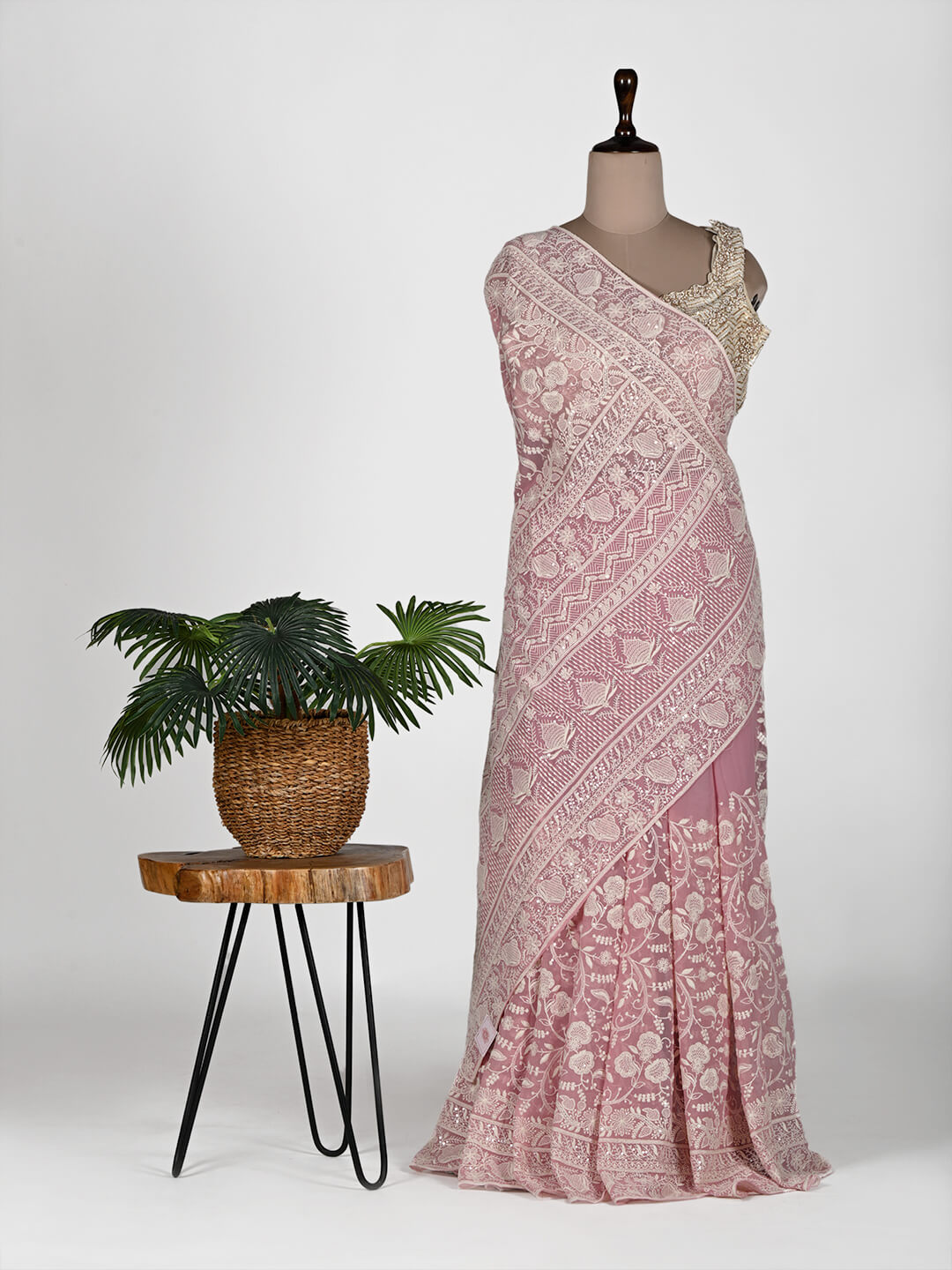 • The yarns of a lucknowi saree in georgette have plain weaves with a slight twist in the opposite directions.