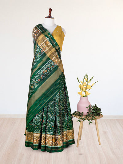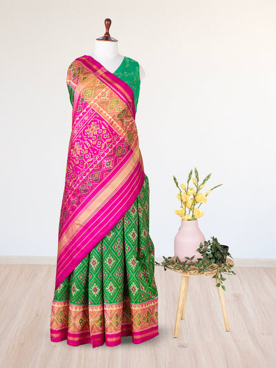 Patola is a century-old double-ended Ikat weave. The unique weaving pattern boasts its origin in Patan in the northern zone of Gujarat. The given weaving process is known to involve complicated and intricate process of tie-dyeing on the weft and wrap before weaving. It is a highly esteemed weave that receive acknowledgement by connoisseurs as both conventional and contemporary art requiring preservation.