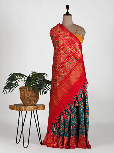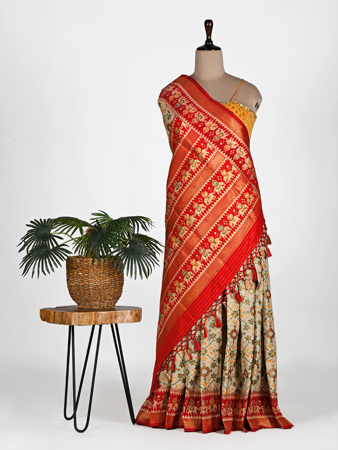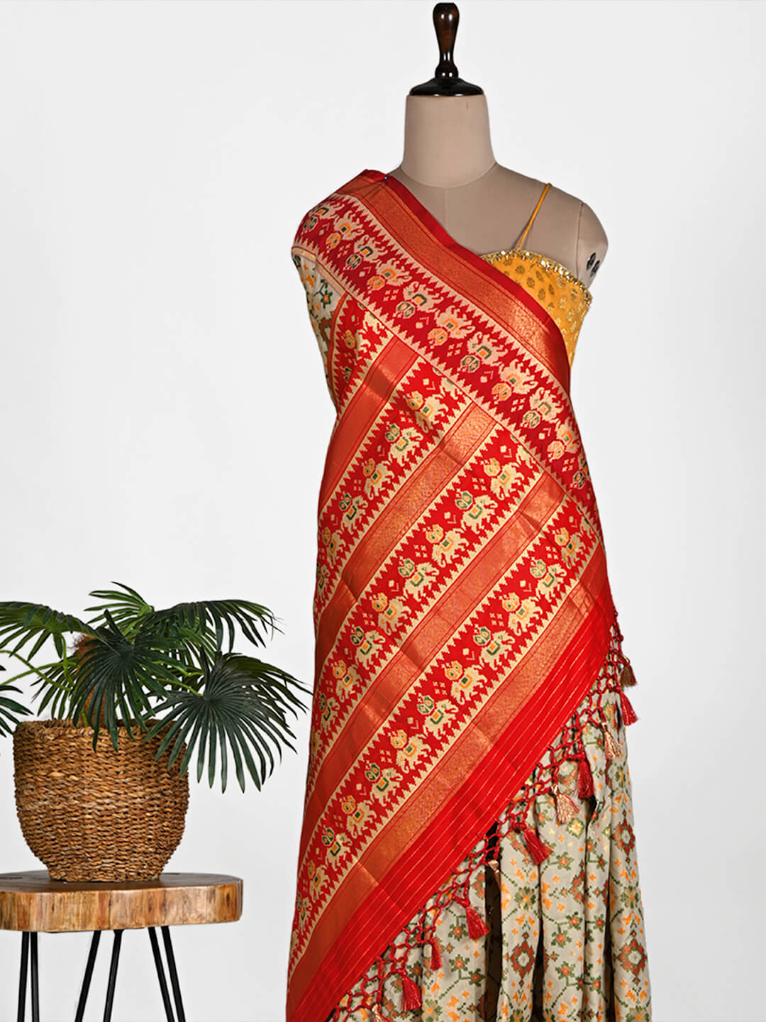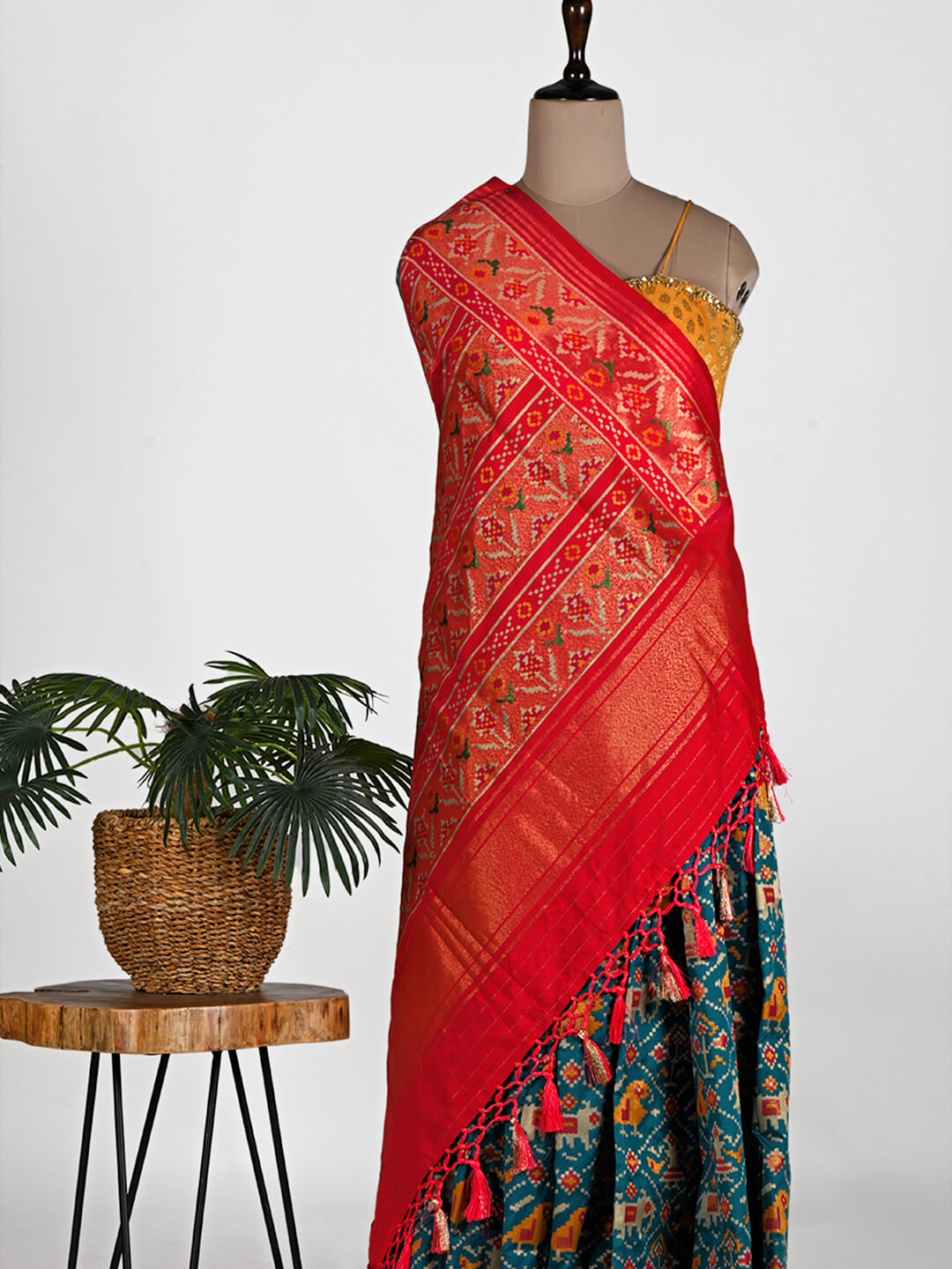 Patola sarees utilize characteristic colors like cochineal, catechu, turmeric, indigo, normal lakh, madder roots, harde, ratnajyot, manjistha, Katha, pomegranate skin, kesudo, henna, marigold bloom, and so on in the shading procedure. Copper sulfate, alum, tin chloride, potassium dichromate, ferrous sulfate, and other mordents are also utilized. The after-effect of which is bright tones denoted by patterns such as bright red, yellow, and dark green.