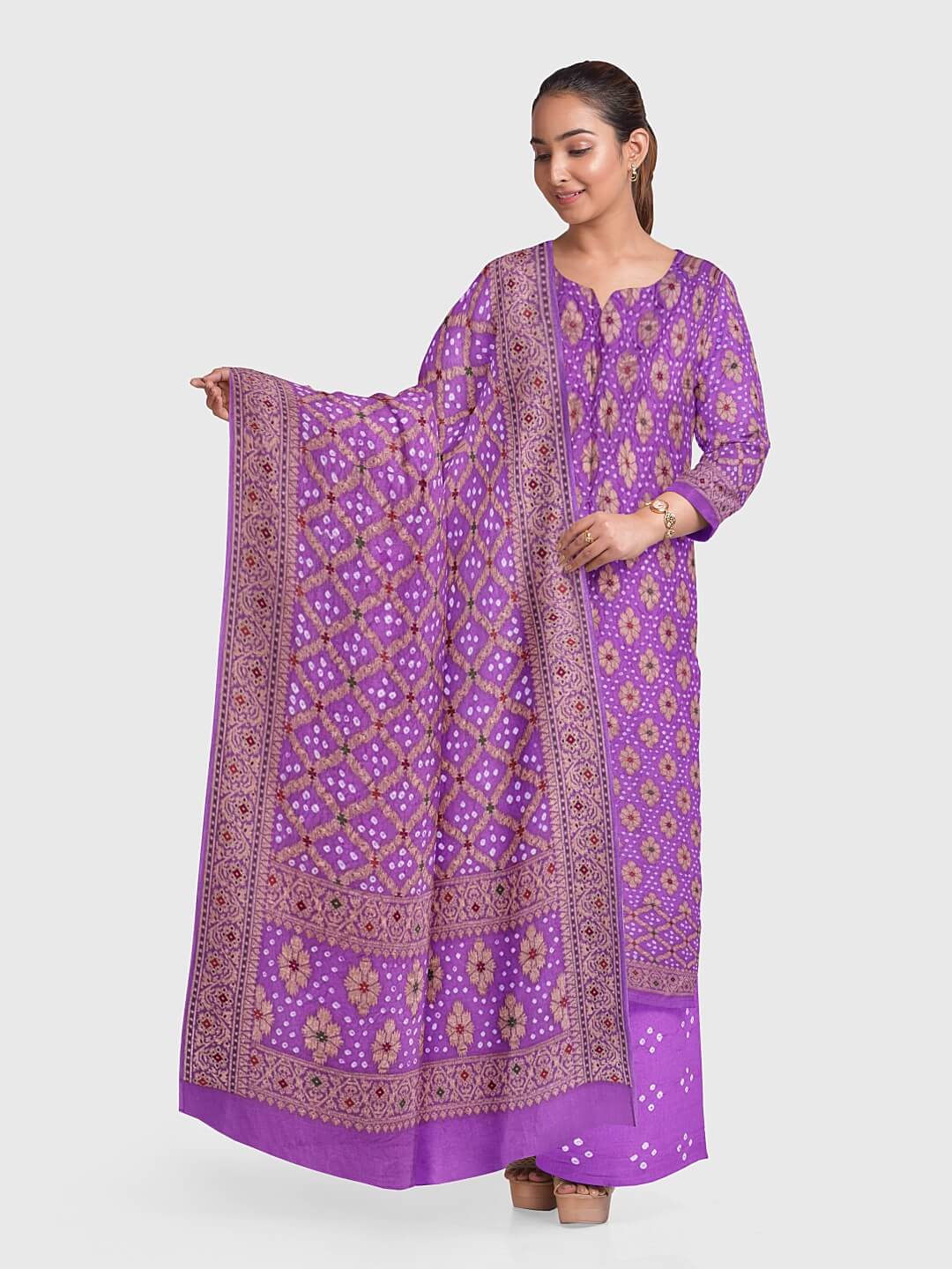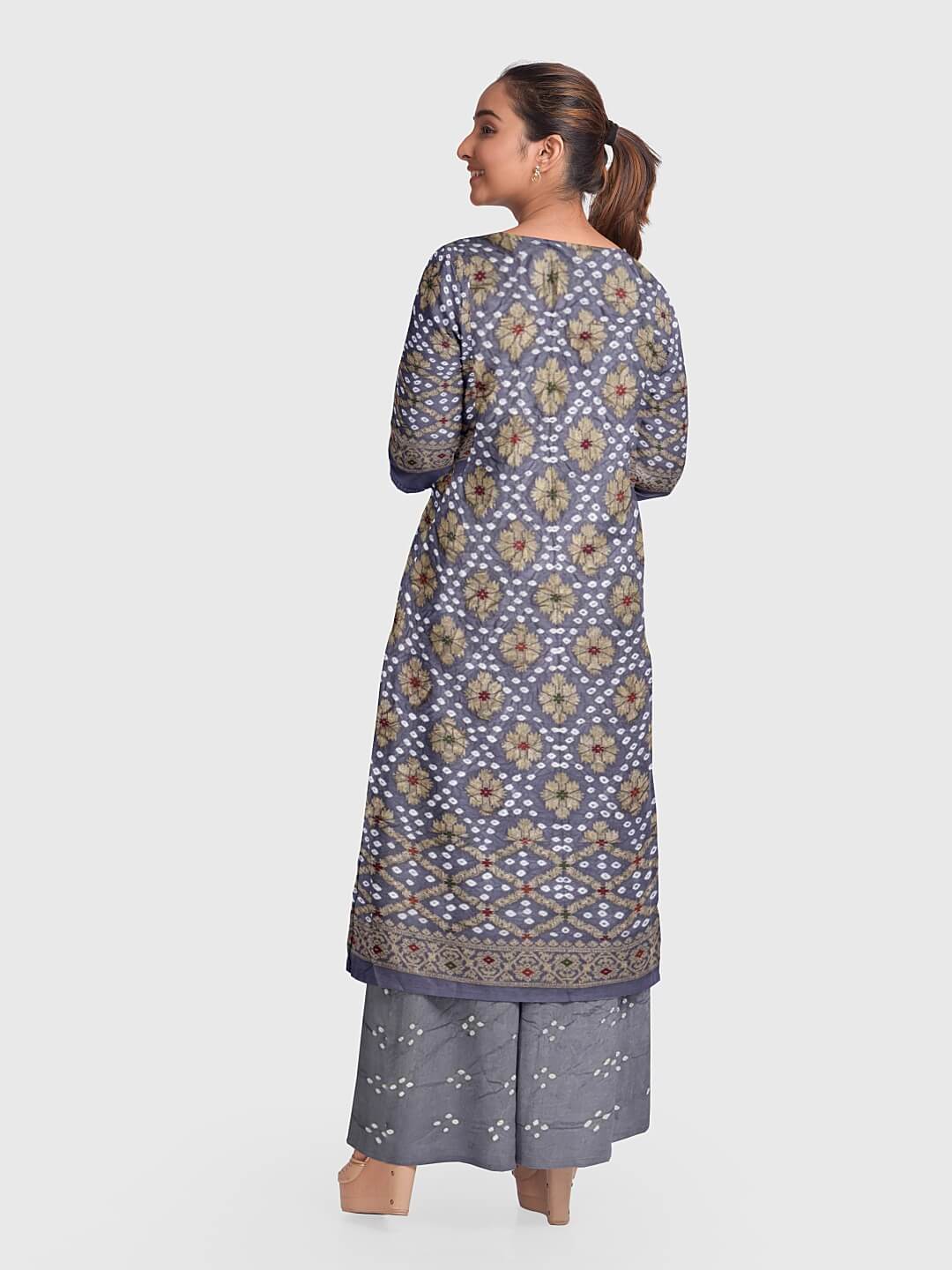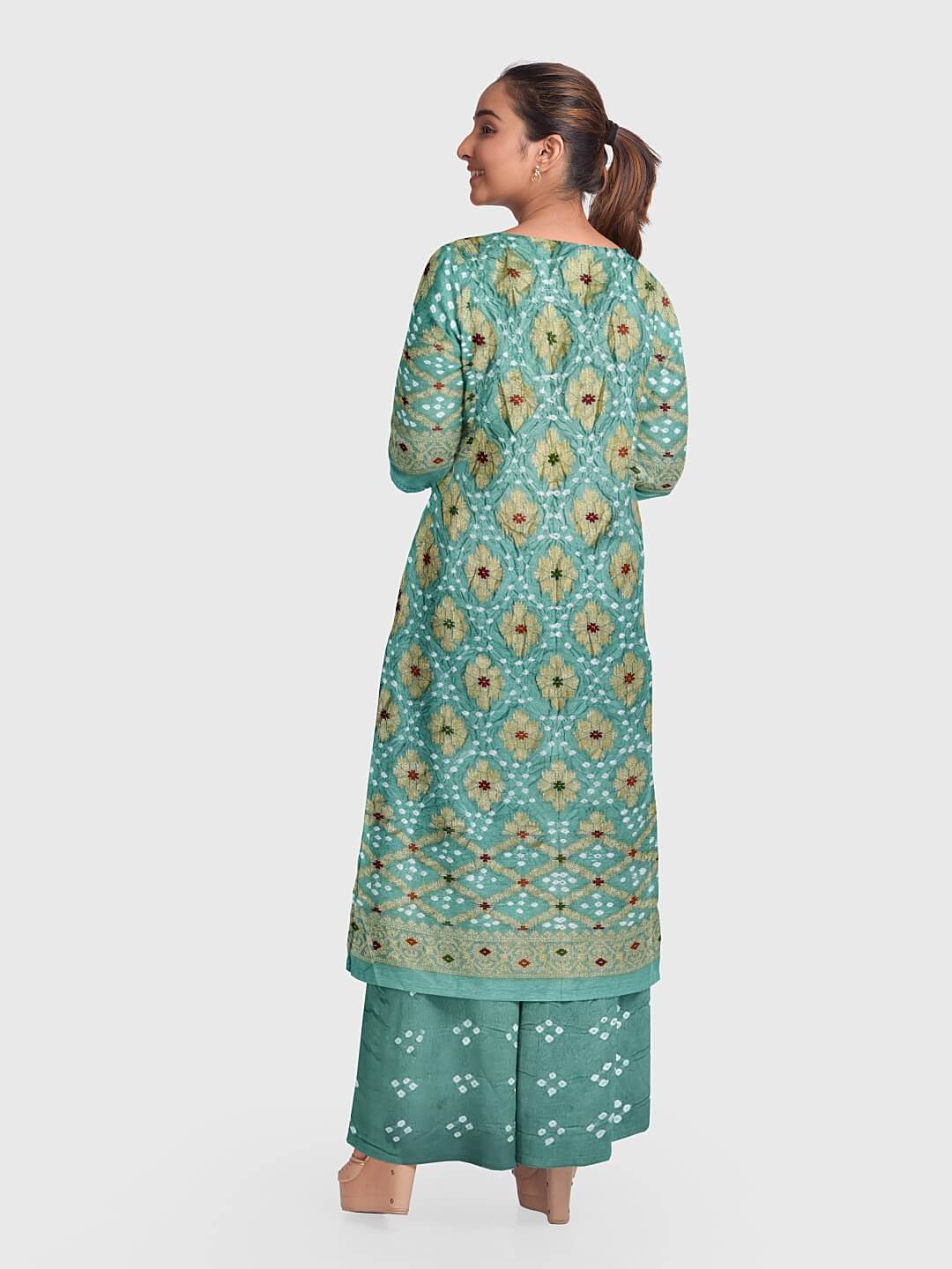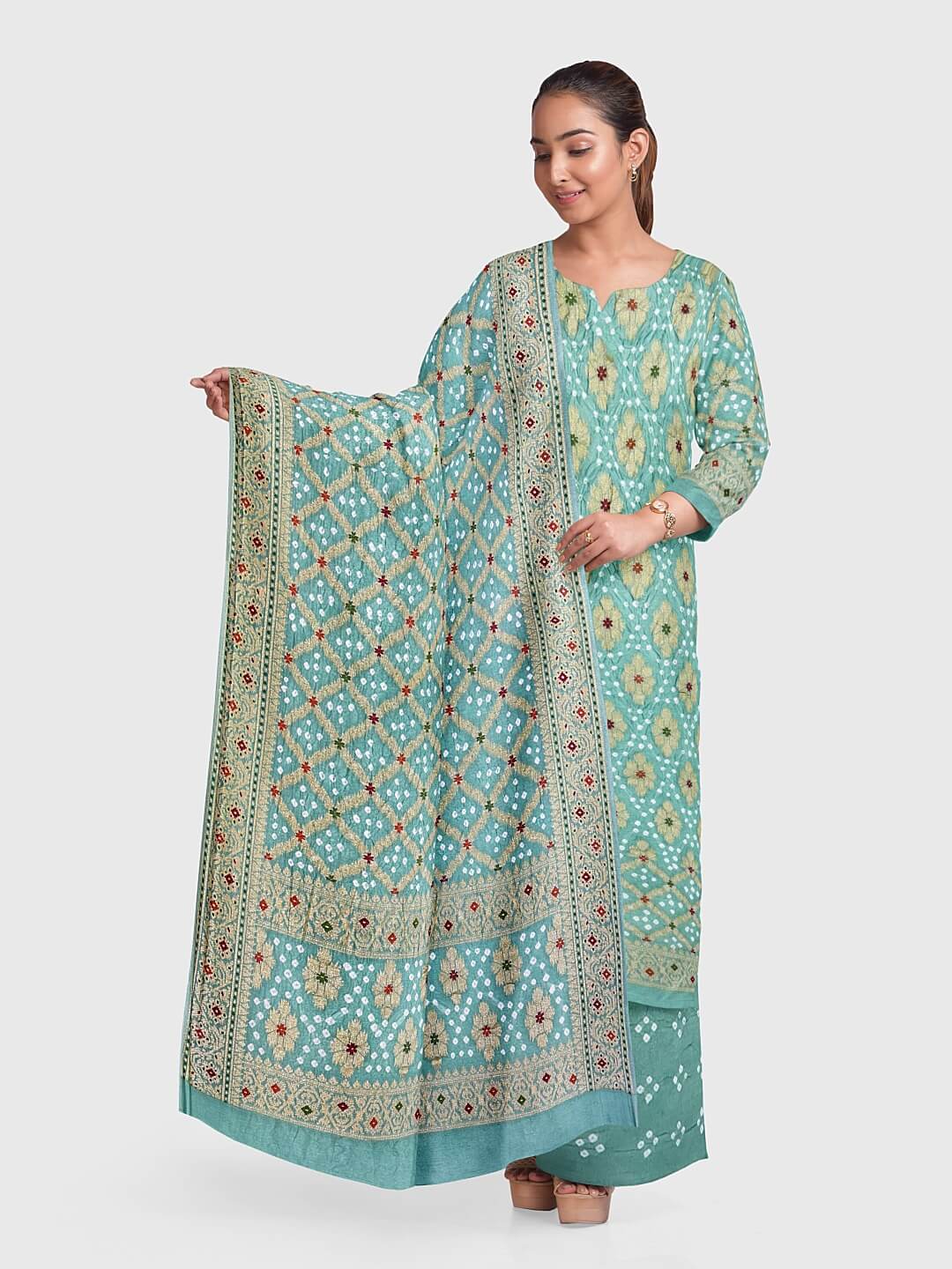 The Bandhani suits / Bandhani salwar kameez are created using a method known as the bandhej. Therefore, the fabric utilized here undergoes a tie-dye procedure. This is a style that is practiced mostly in the Indian states of Gujarat and Rajasthan and is also known as Bandana or Bandhini. The phonetics rely upon how the local people living in different areas pronounce where such a method is usually practiced.