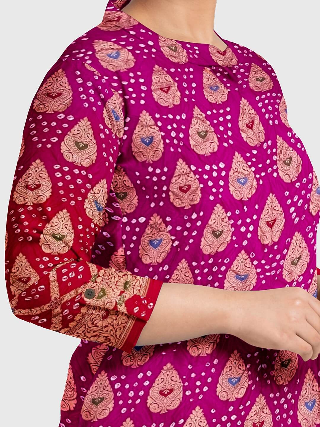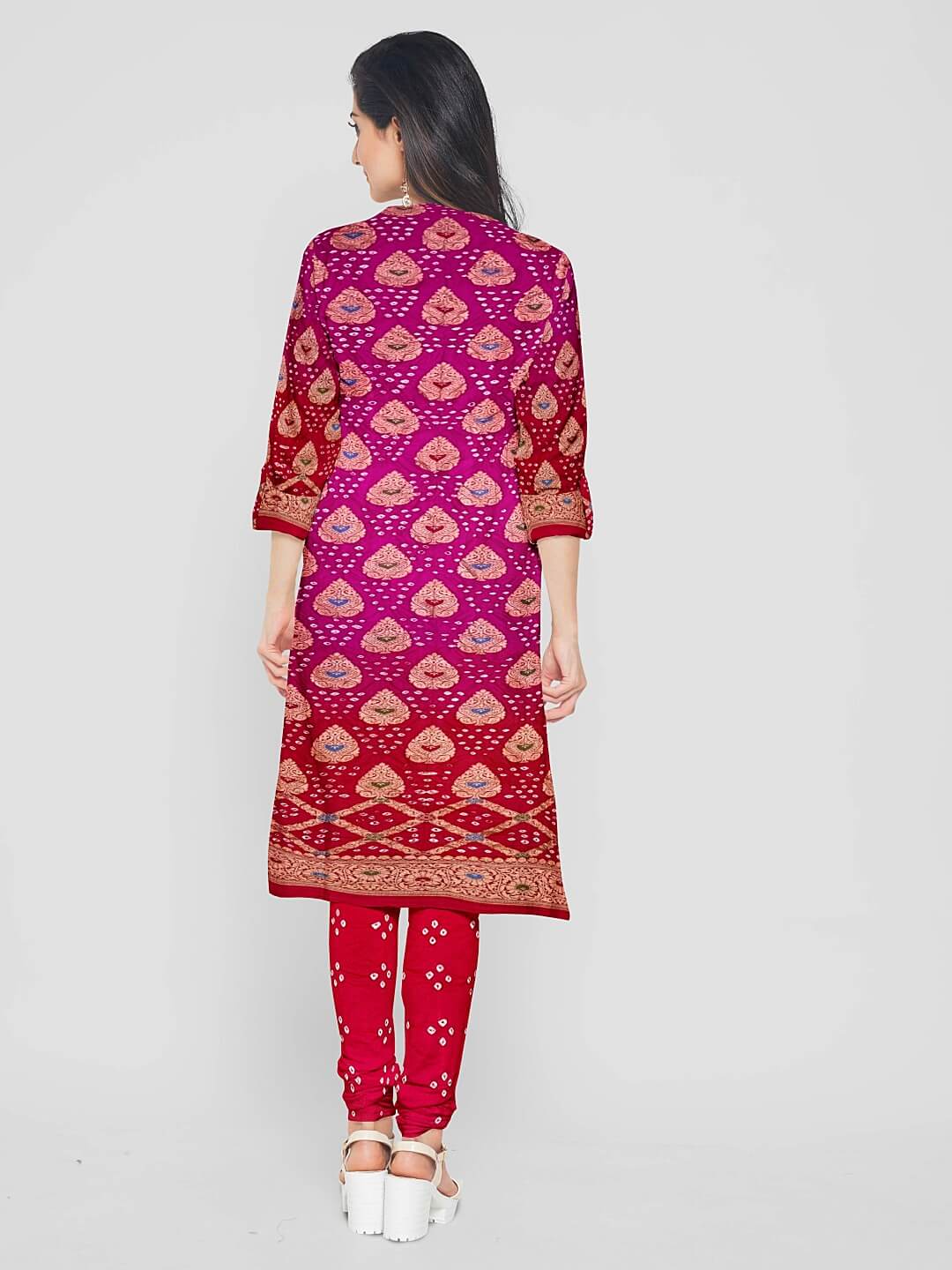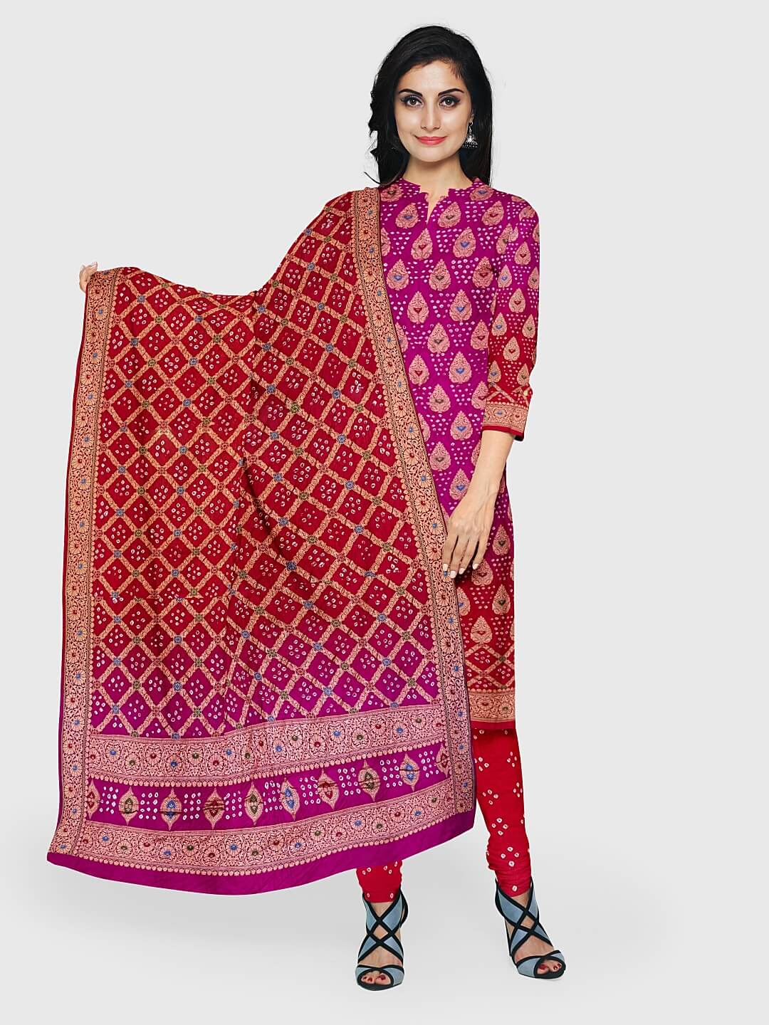The Bandhani suits / Bandhani salwar kameez are created using a method known as the bandhej. Therefore, the fabric utilized here undergoes a tie-dye procedure. This is a style that is practiced mostly in the Indian states of Gujarat and Rajasthan and is also known as Bandana or Bandhini. The phonetics rely upon how the local people living in different areas pronounce where such a method is usually practiced.