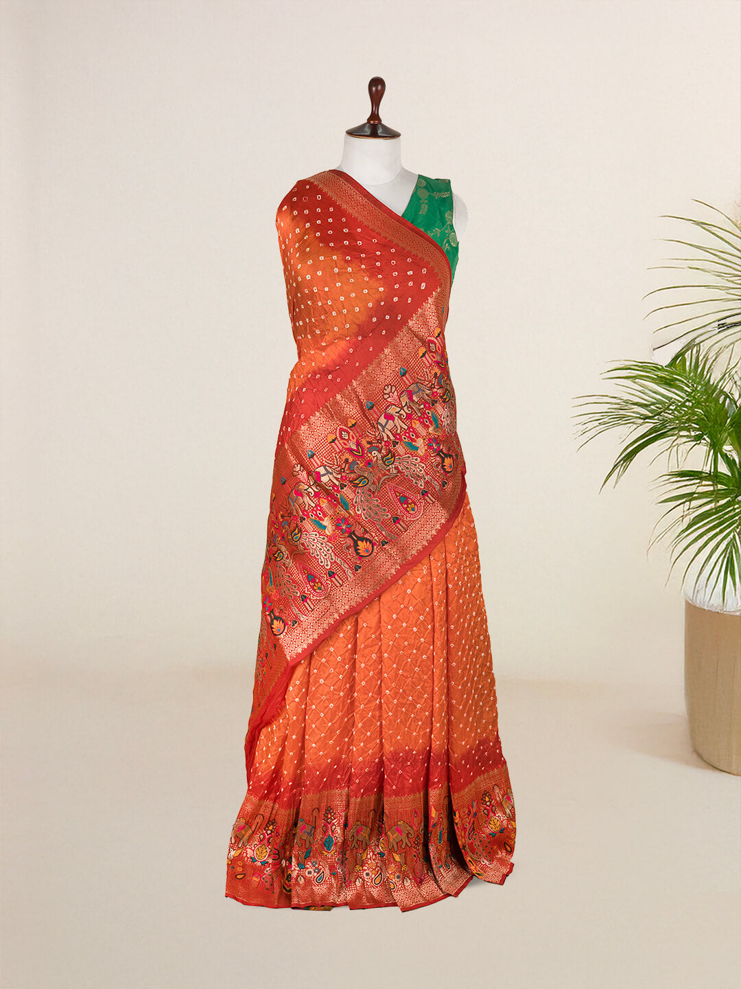 Orange And Red Paithani Bandhani Saree in Synthetic
